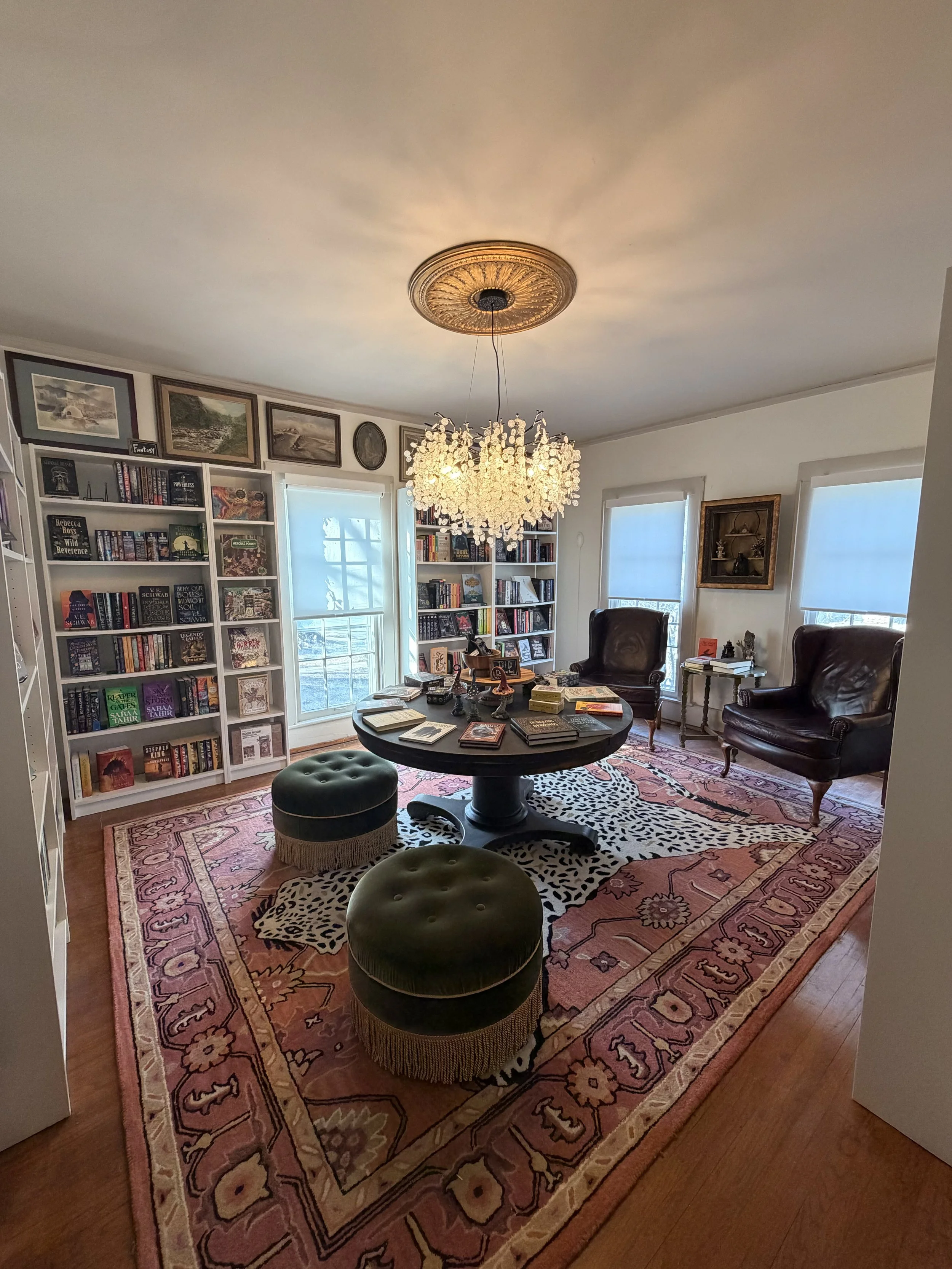 Today, The Story House is an independent bookstore, art space, and growing cultural hub. Pinky’s artwork lives throughout the building — not as nostalgia, but as foundation. Upstairs rooms are being reimagined for workshops, readings, lectures, and reader’s theater, with plans for coffee, community gatherings, and eventually a black box theater in the carriage house out back.